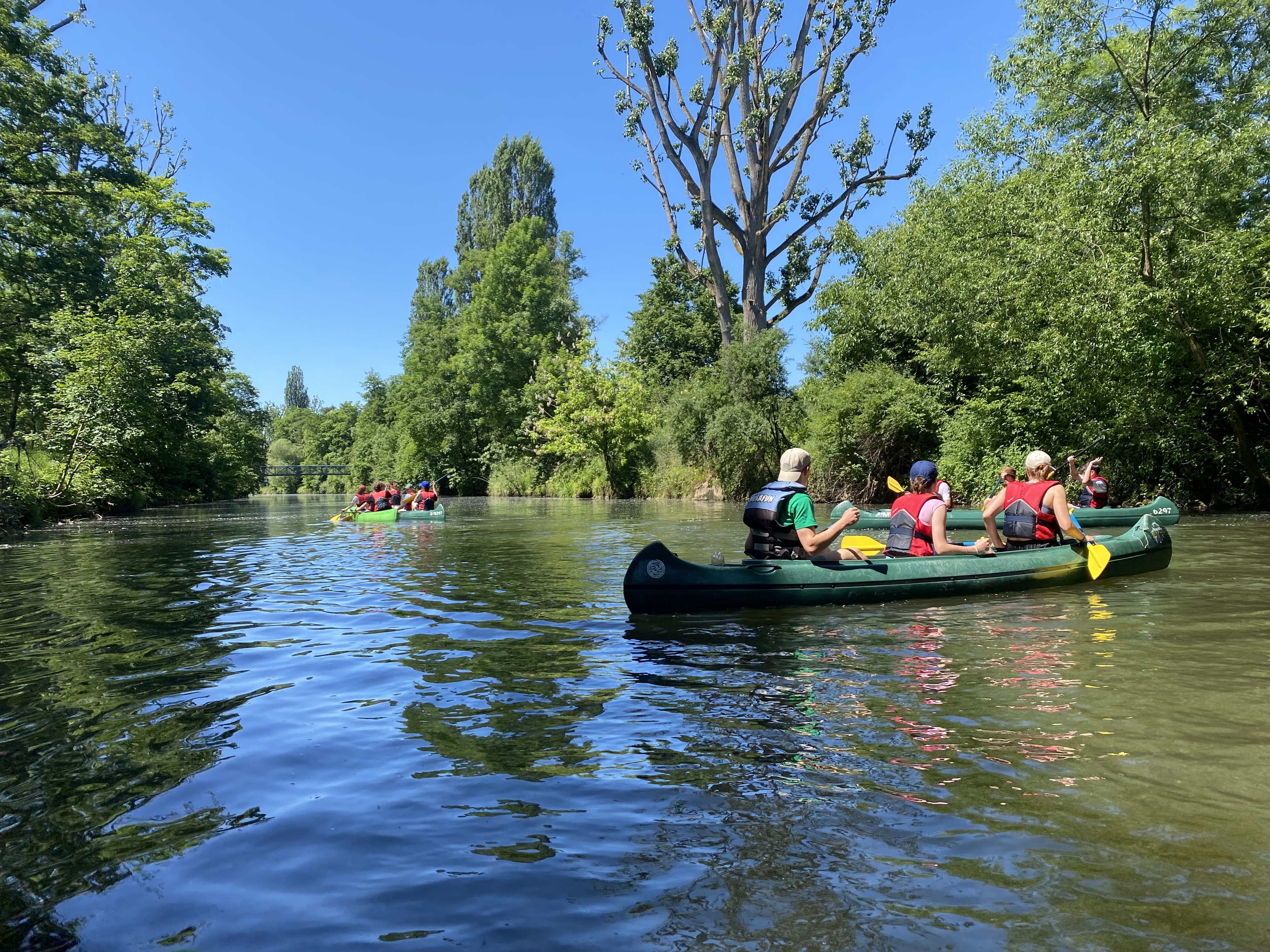 Wir verbrachten sonnige Tage draußen, mit Batiken, Basteln und Bällen. Ein Stadtausflug nach Heilbronn und ein Quizabend durften auch nicht fehlen. Freitags ließen wir unsere Leihkanus zu Wasser, um auf dem Neckar zu paddeln. Samstagsabends grillten wir gemeinsam über unserem Lagerfeuer und verweilten noch bis spät in die Nacht. – Eine erfrischende Auszeit vom Alltag.